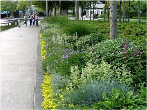 除此之外,混合花境也是一种常用的配置方式。它不但能营造层次、色彩、质地、季相等美感,还能更形象且突出地展示出植物本身多彩的自然特性。将一些优秀的观花观叶花灌木,飘逸优雅的观赏草,色彩艳丽的宿根花卉有效的组合布置,大大增加了景观的可看性。将一些常绿的色叶灌木或大型的常绿观赏草等作为景观骨架有效地保证了冬季的景观效果,让花境从真正意义上做到了“三季有花,四季有景”的景观观赏效果。