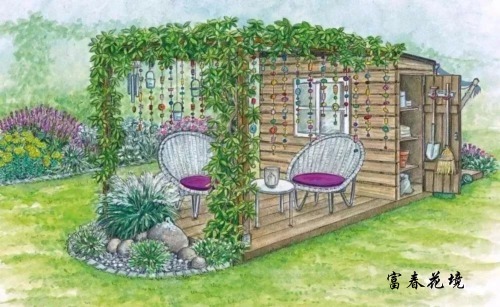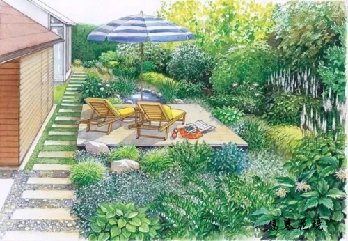 经过分析之后,你的脑袋里可能已经有了具体的想法了,不要着急实施,不妨先画一画草图,也不需要多好的画画功底,主要是为了心中有数,确定植物摆放位置和需要的量。注意这里需要预留小径,空出座椅的位置,初学时容易忽略这些空间。