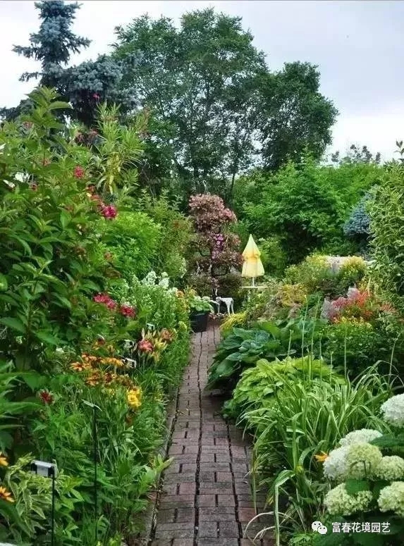 如林缘混合花境营造时靠近树林的中、高层植物种植观赏花灌木和生长缓慢的小乔木,前景植物则以低矮的一二年生花卉为主,中间层穿插种植长势高的观赏草类和球(宿)根花卉。可以打破各类植物间的明显界线,高低错落,一年四季季相变化丰富又看不到明显的空秃,使景观更趋自然。
