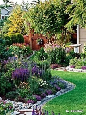 把以上植物定位好后,根据现场的空缺情况布置宿根花草。用曲线或者直线将草与花区分开种植,以便控制以后的长势。此处花园就以石与沙粒起到分界的作用。花境植床稍高出地面,形成 5°~10°的坡度,以利于排水。花境内的植物多为自然式,主要欣赏其本身特有的自然美以及植物组合的群体美。常被用到的球宿根花卉有:美人蕉,百合,柳叶马鞭草,天人菊,大花金鸡菊,飞燕草,波斯菊等。