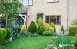 它们可以填补北方冬季植物贫乏的空白,亦可作为花园的基础背景色调,在花园中的地位尤其重要。它们有着耐修剪、寿命长、好种易活的优势,可以打造出各种形态、颜色的差异,使得花园的轮廓线自然有趣,如这里的造型龙柏、云杉、 桧柏、翠蓝柏、小叶黄杨篱等。另外,在北方还可以使用孔雀柏、竹子等植物替换,满足冬季的观赏需求。用石块堆砌的新月形的花池装点着露台的周围,修剪整齐的黄杨木排列在藤架的立柱之间,里面养的落新妇、矾根、风铃草都是喜欢在花园背阴地方安家的植物,两组牵牛花吊篮呈现出粉色、紫色和白色组合的色调。