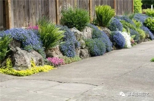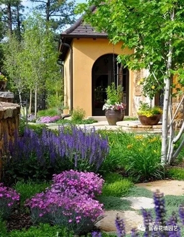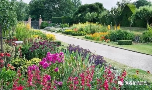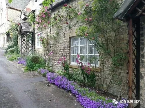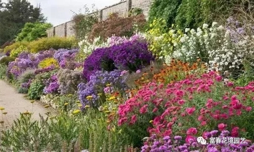 宿根花卉在庭院的栅栏边、树丛下以及屋顶花园的种植槽内也可以大量栽植,不仅可以丰富建筑物立面,美化周边环境,还可以调节室内视线。墙基处栽植宿根花卉,可以缓冲墙基与地面之间生硬的感觉,单色面的墙基可以种植宿根花卉,使墙面具有如同纸张作画的效果。