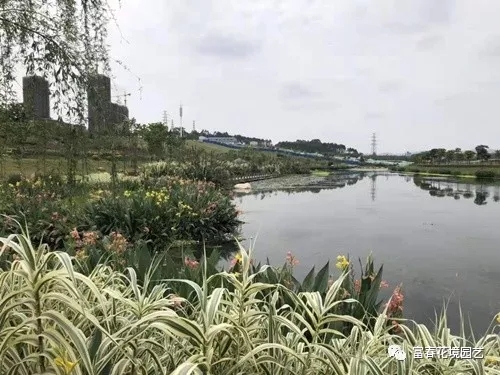 水系景观中,水生鸢尾、马蔺、花叶芦竹等水生宿根花卉,依水而栽不仅丰富了水景的变化,也增加了绿化层次感。