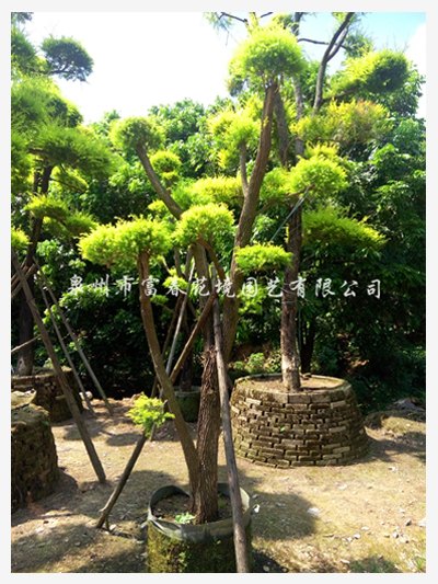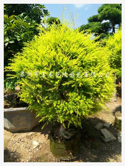 常绿热带速生乔灌木,深根性树种,主干直立,是优良的彩叶树种之一,植株耐修剪,可进行各种造型,枝条密集且细长柔软,层层向上扩展,树形十分优美。叶片金黄色或鹅黄色,密集分布于锥形树冠,可产生强烈的视觉冲击。花乳白色,顶生头状花序或短穗状花序,于夏末盛开。具极高观赏价值,有金黄、芳香、新奇等特点。
