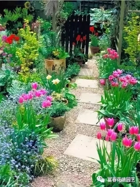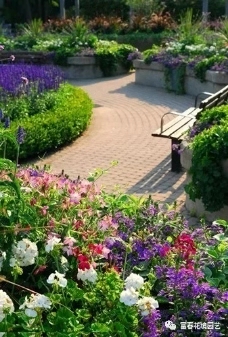 在公园道路边,花境主要供人随时驻足欣赏,所以花境植物团块可相对较小,植物种类多样,层次丰富。可在道路一侧布置单面观花境,也可在道路两侧布置对应式花境。如果花境沿路布置较长,还应有间断性的景观变化。而且前缘的花卉不应侵占路面,影响道路功能。所以前缘花卉不宜选择易倒伏的、蔓延性较强的花卉,或者可用低矮的金叶佛甲草、美女樱等镶边植物以及砖、木材加以围挡。