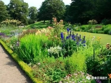 花境在公园中的应用基本有两种类型,一种是布置在林缘、路缘、建筑物基础处的装饰性配景;另一种是以花境为主体。每种环境的花境景观会有不同的特色,所以呈现的花境景观更为多样和丰富。而且在公园中有专人养护,因此公园中的花境更为多样化和精细化。